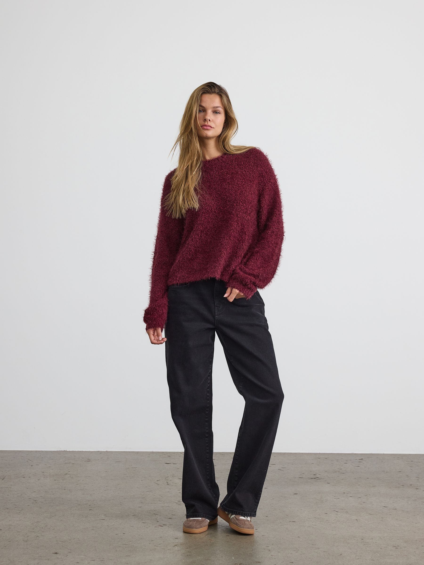 – Knitted pullover – Fluffy material – Round neckline – Long sleeved – Dropped shoulders – Relaxed fit- Model is 179cm tall and wearing size S