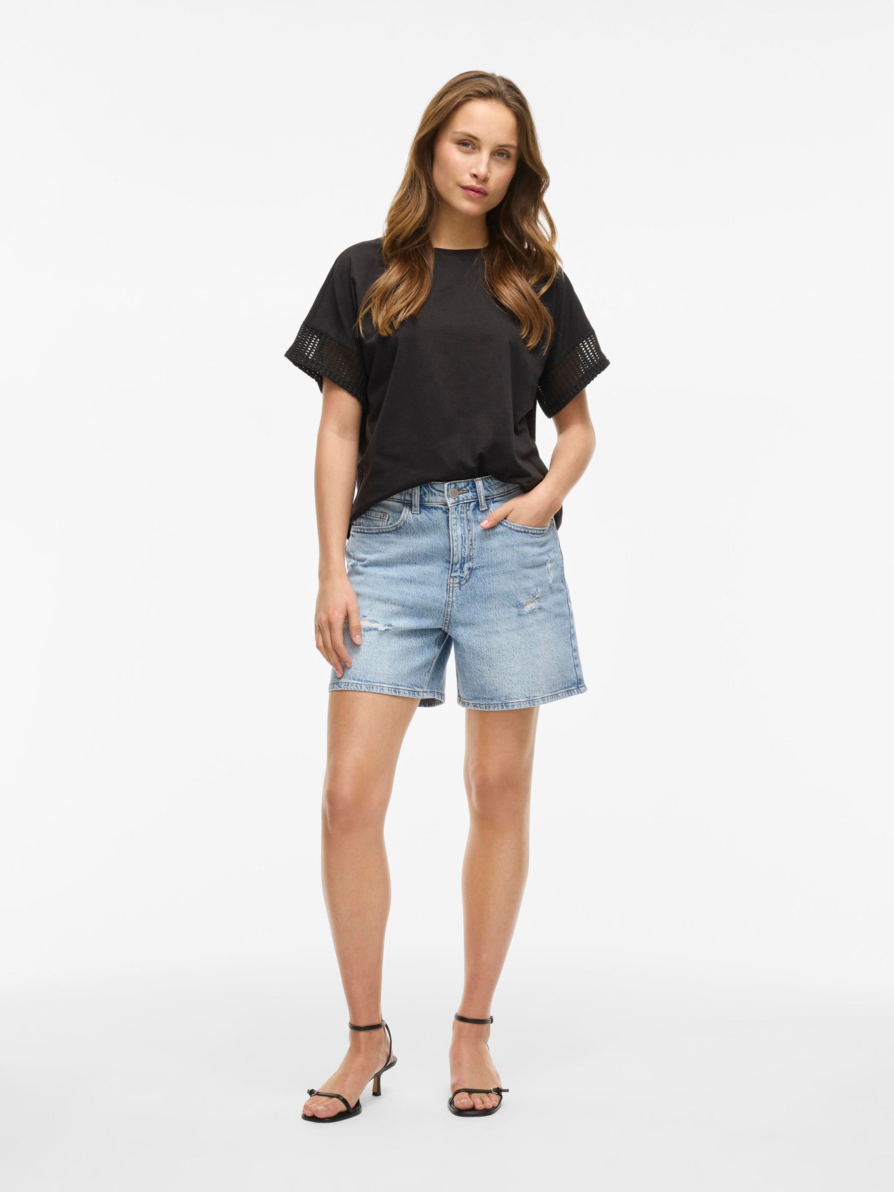 • High waist denim shorts• Zip and button fastening• Front and back pockets• Belt loops• Regular fit• Inseam: 14 cm in size 38• Frontrise: 29.5 cm in size 38