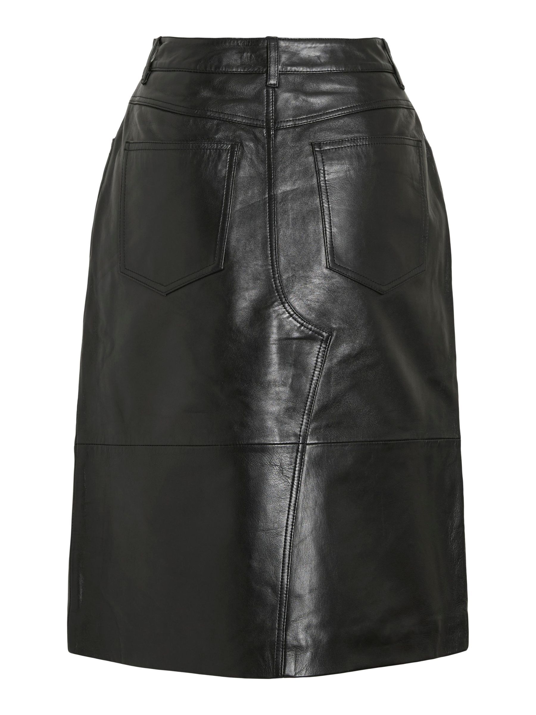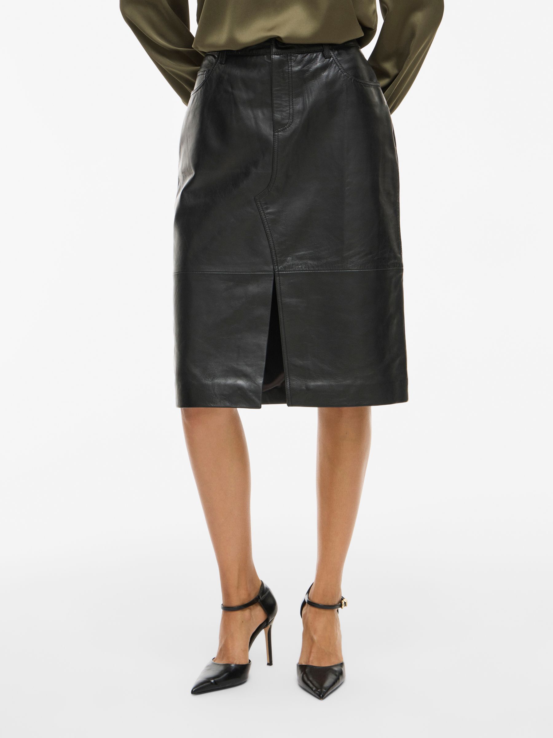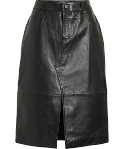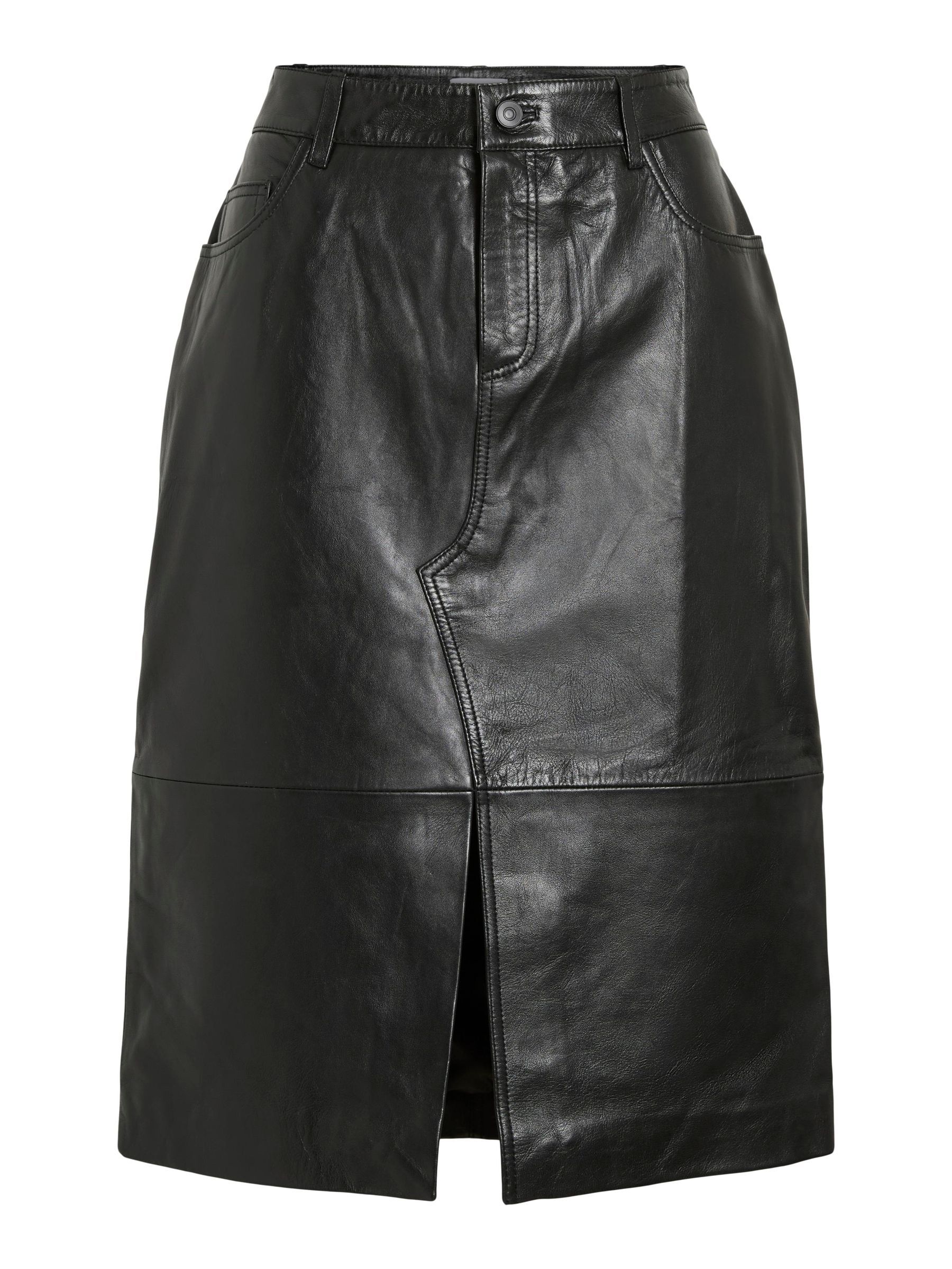 • Midi leather skirt• Mid-waist• Zip and button fastening• Front slit detail• Front and back pockets• Belt loops• Regular fit• Length: 65 cm in size 38