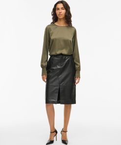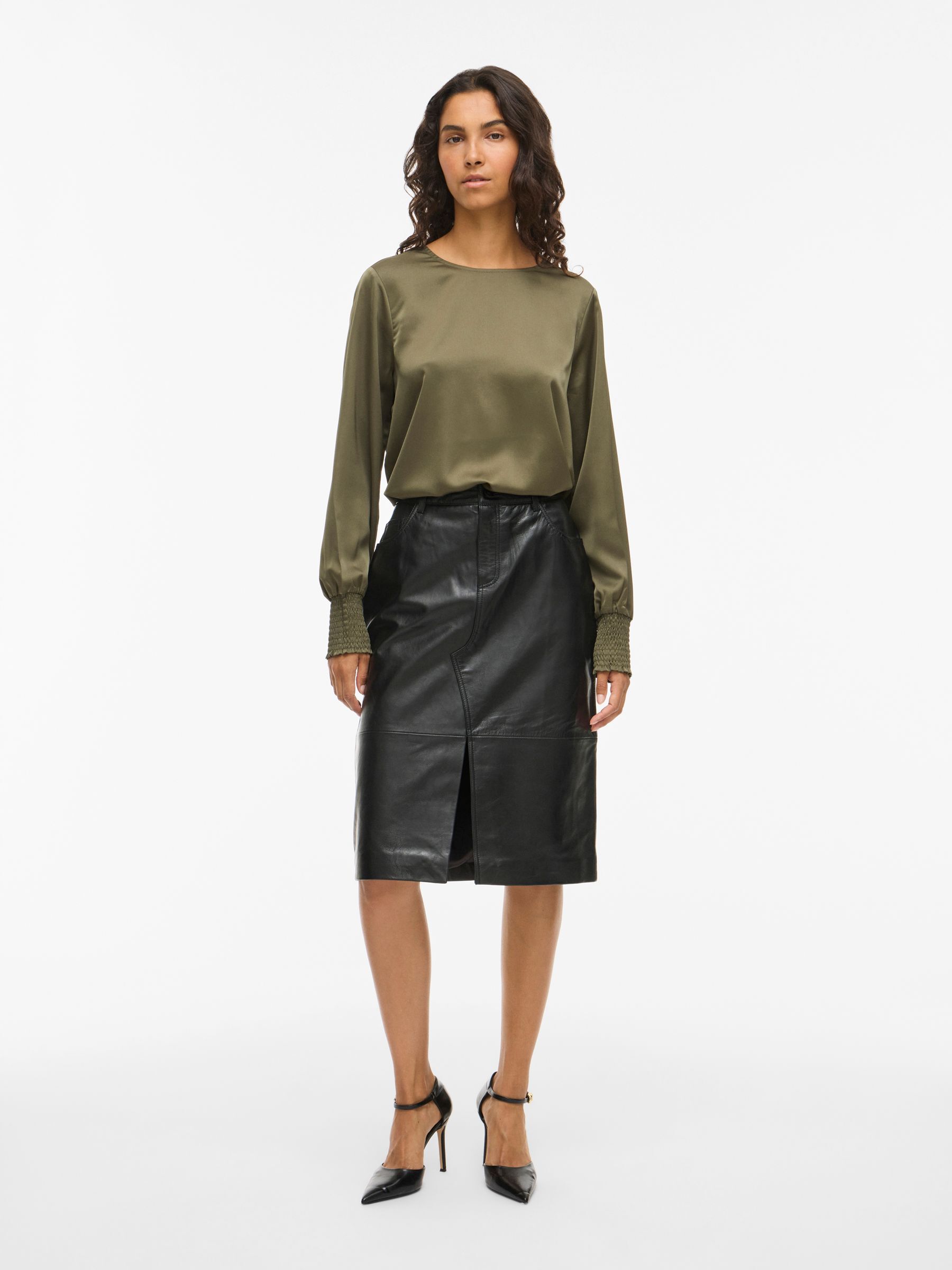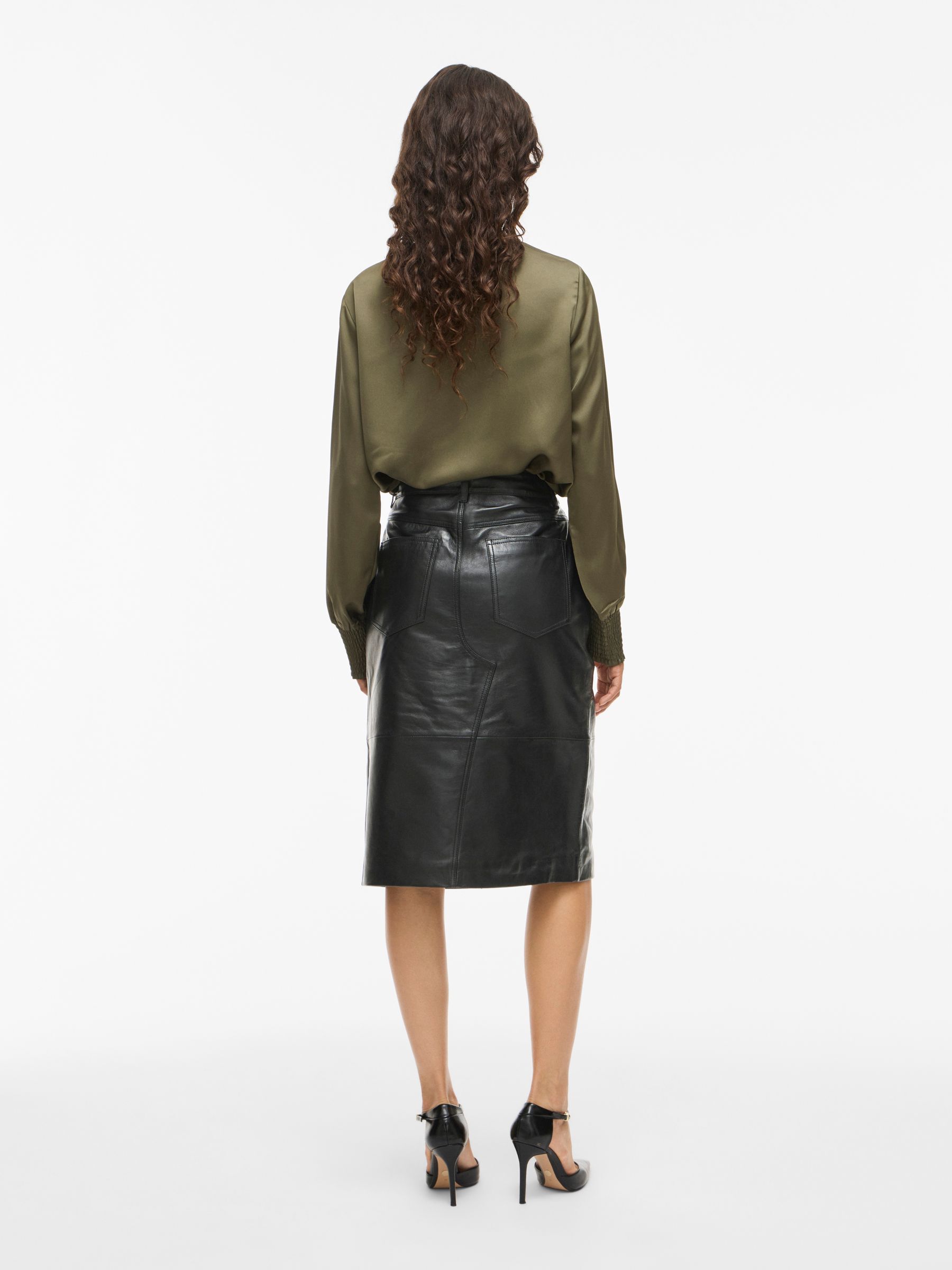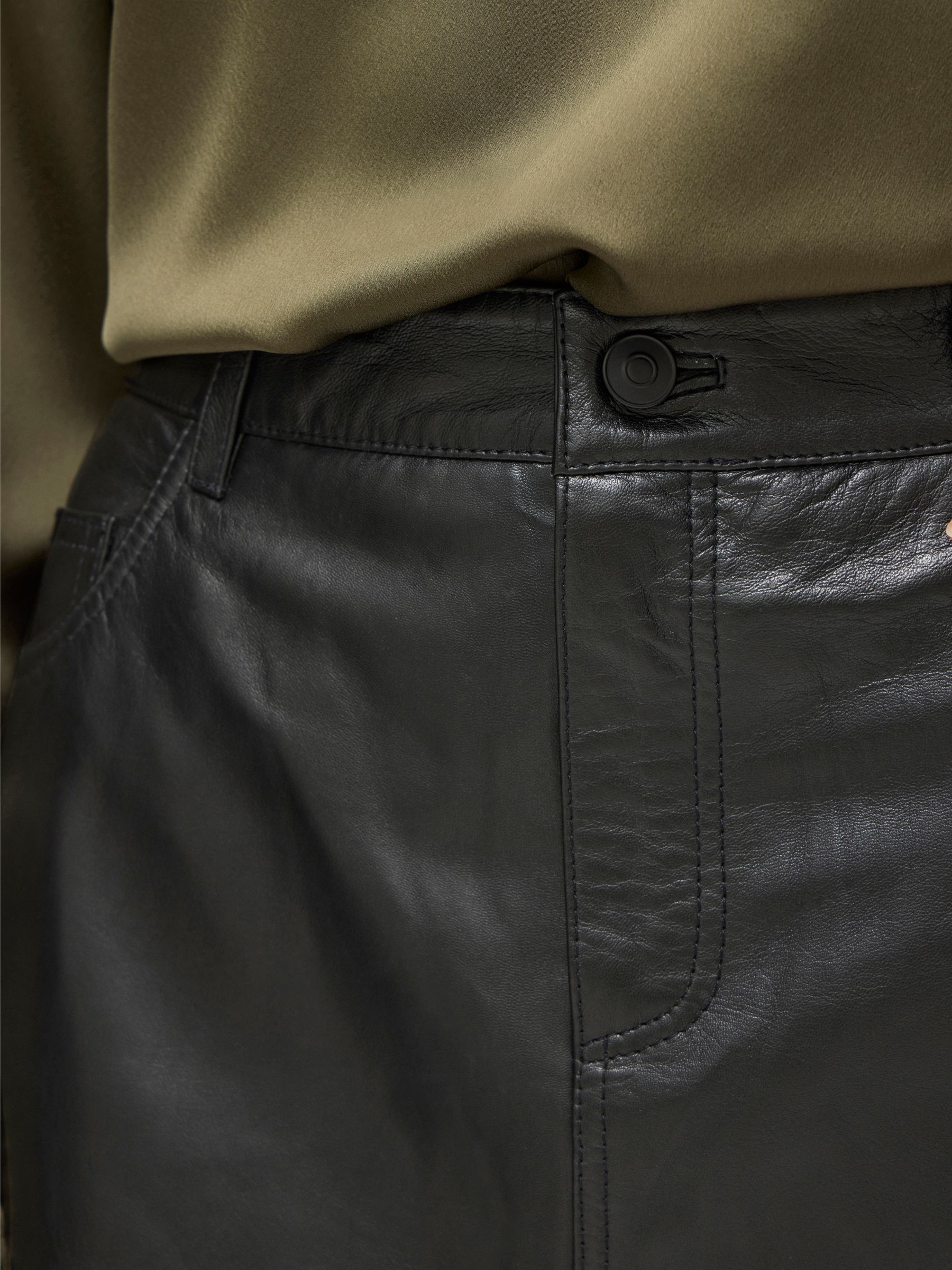 • Midi leather skirt• Mid-waist• Zip and button fastening• Front slit detail• Front and back pockets• Belt loops• Regular fit• Length: 65 cm in size 38