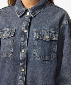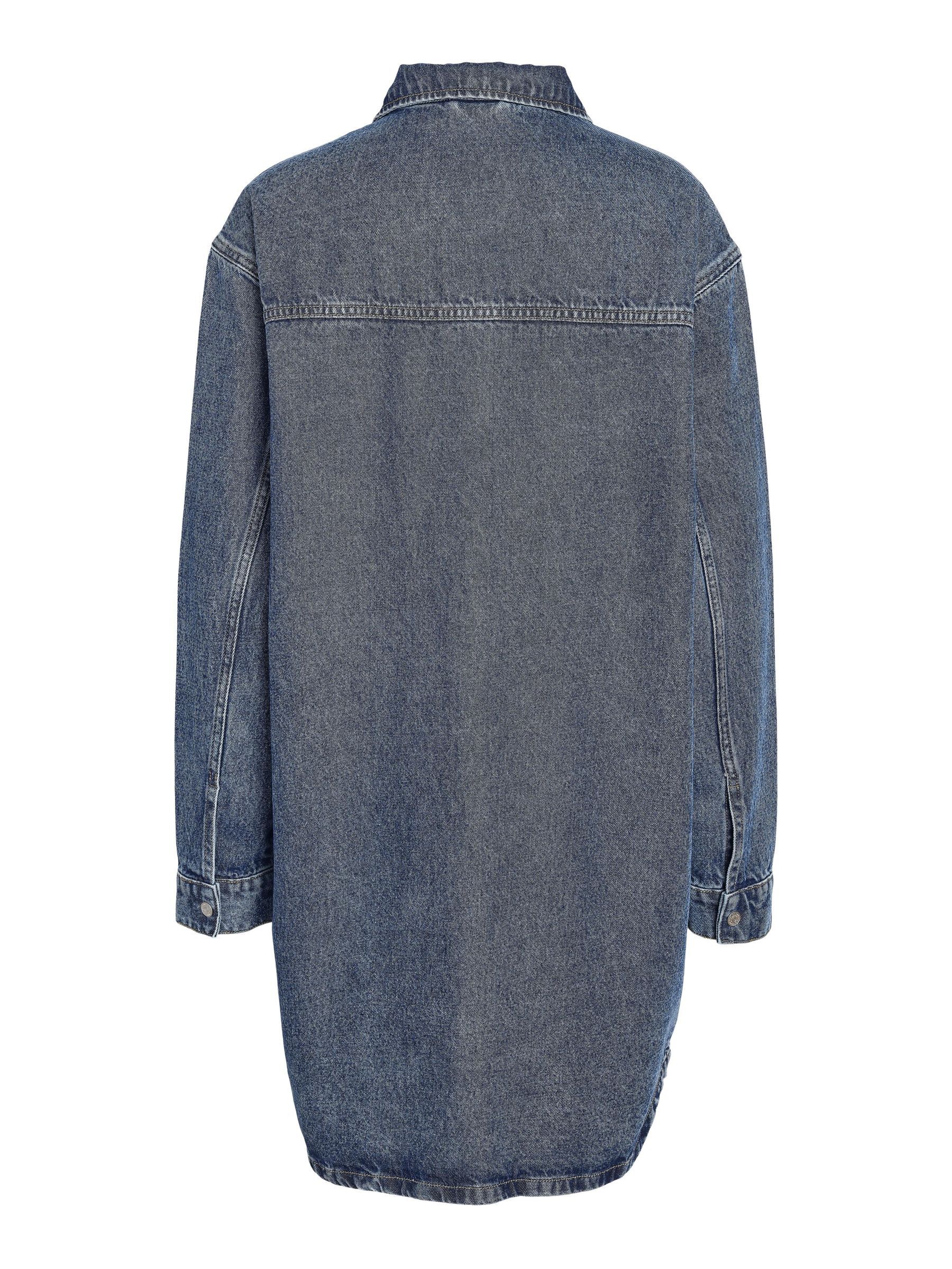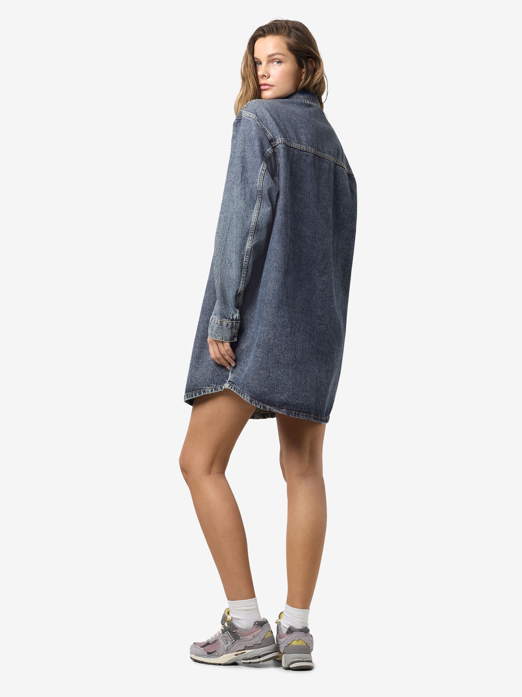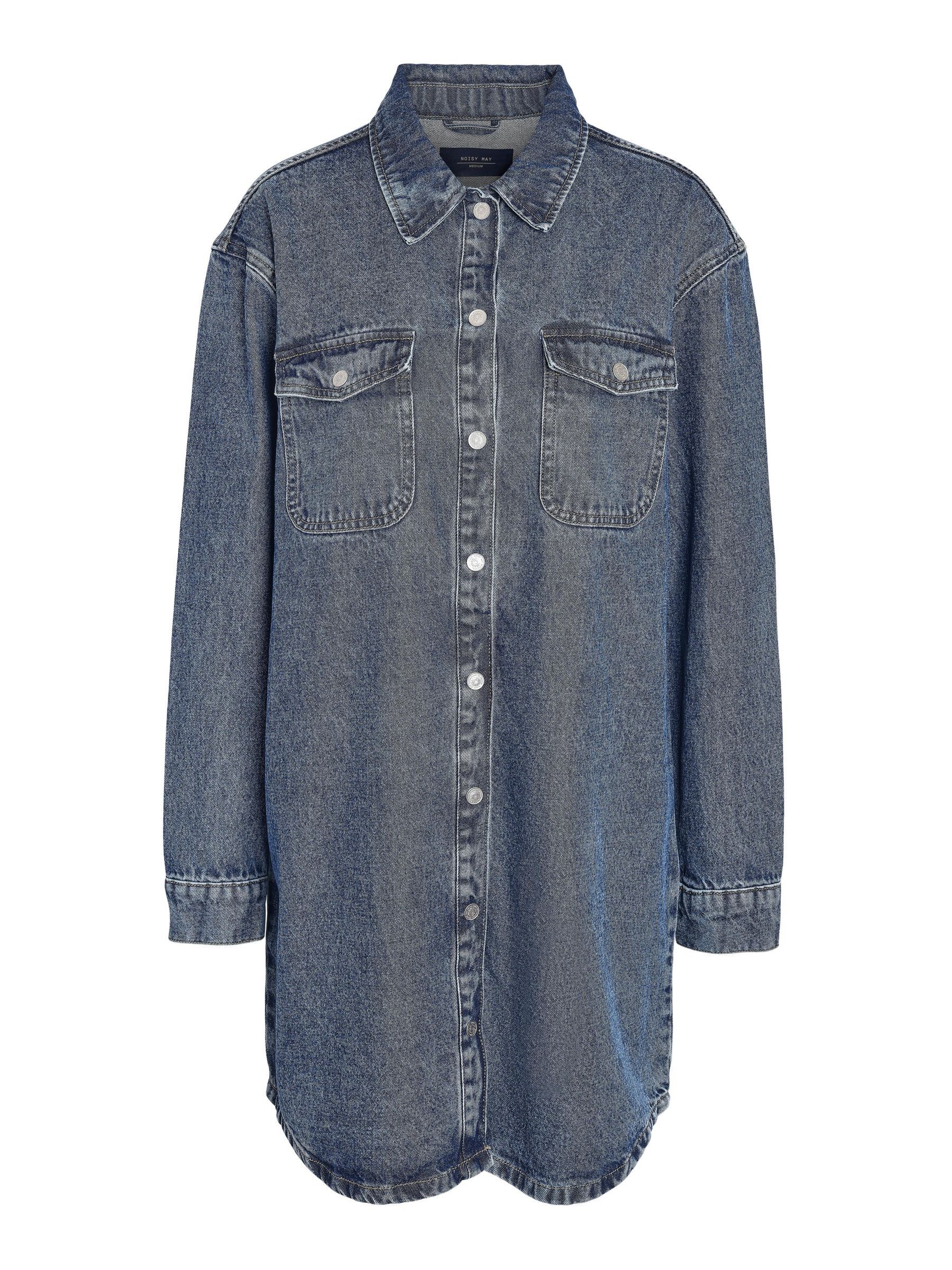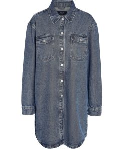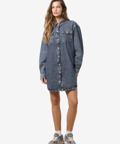 – Mini length denim dress- Spread collar- Dropped shoulders- Long sleeves with rivet button cuffs- Patch pockets at chest with rivet button fastening- Button-up front- Curved hem- Relaxed fit