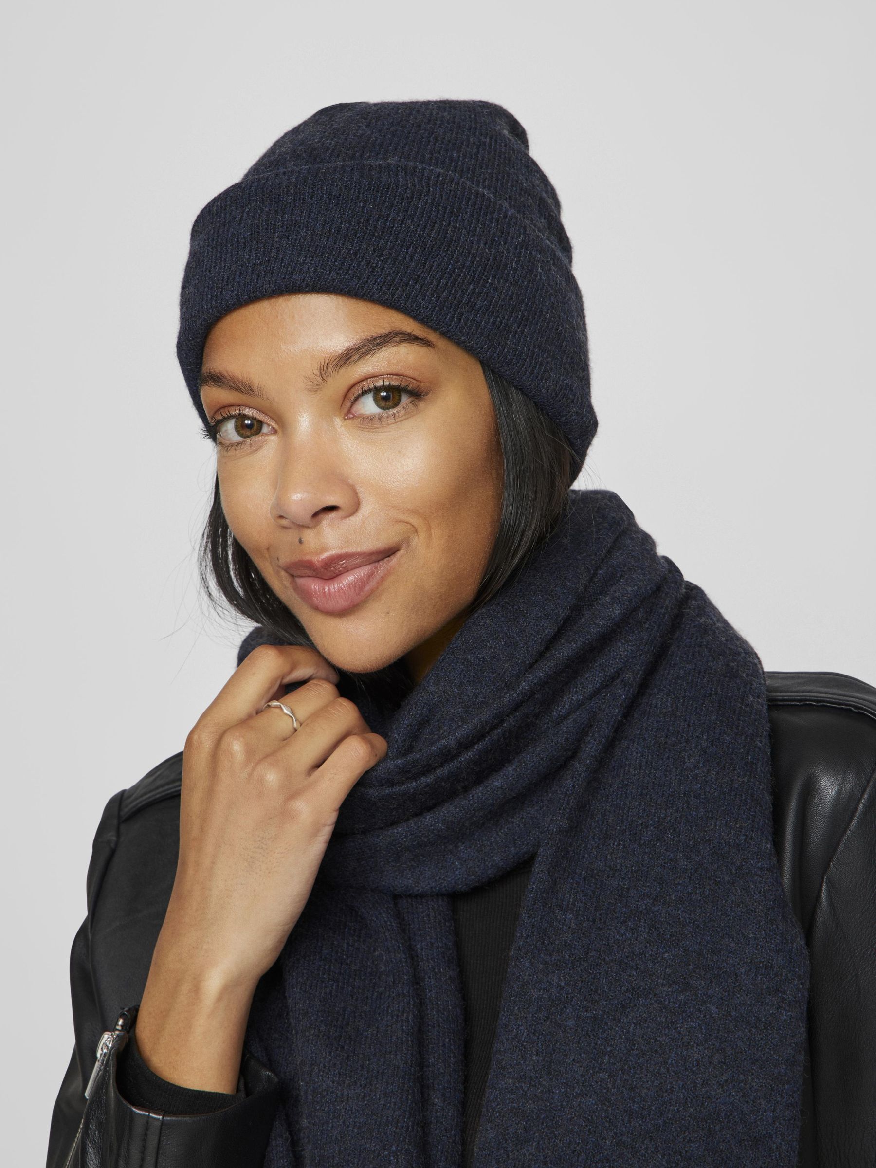 • Basic knitted scarf• Roll-up trims• Soft, stretchy knit