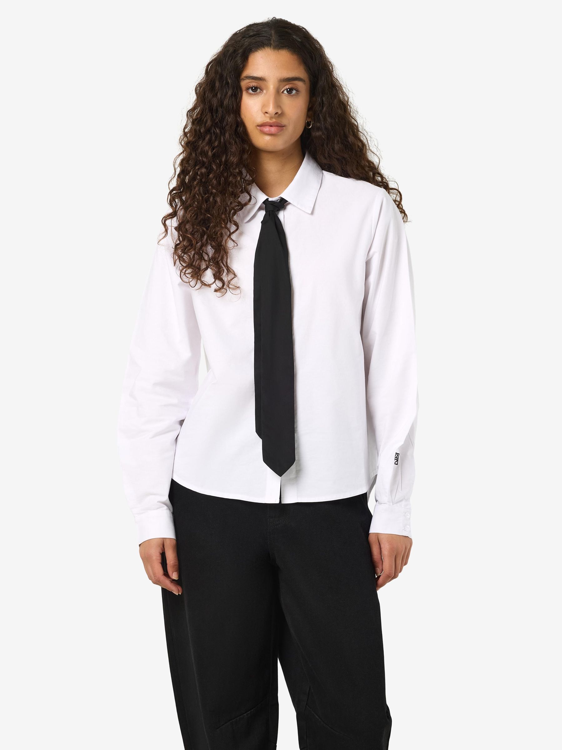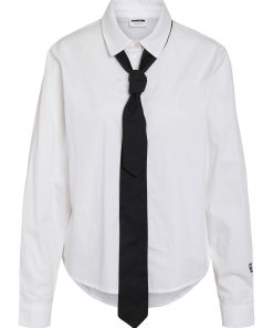 – Shirt with added neck tie detail- Regular collar- Dropped shoulders- Long sleeves with small NM logo embroidery detail- Buttoned cuffs- Button-up front- Relaxed fit