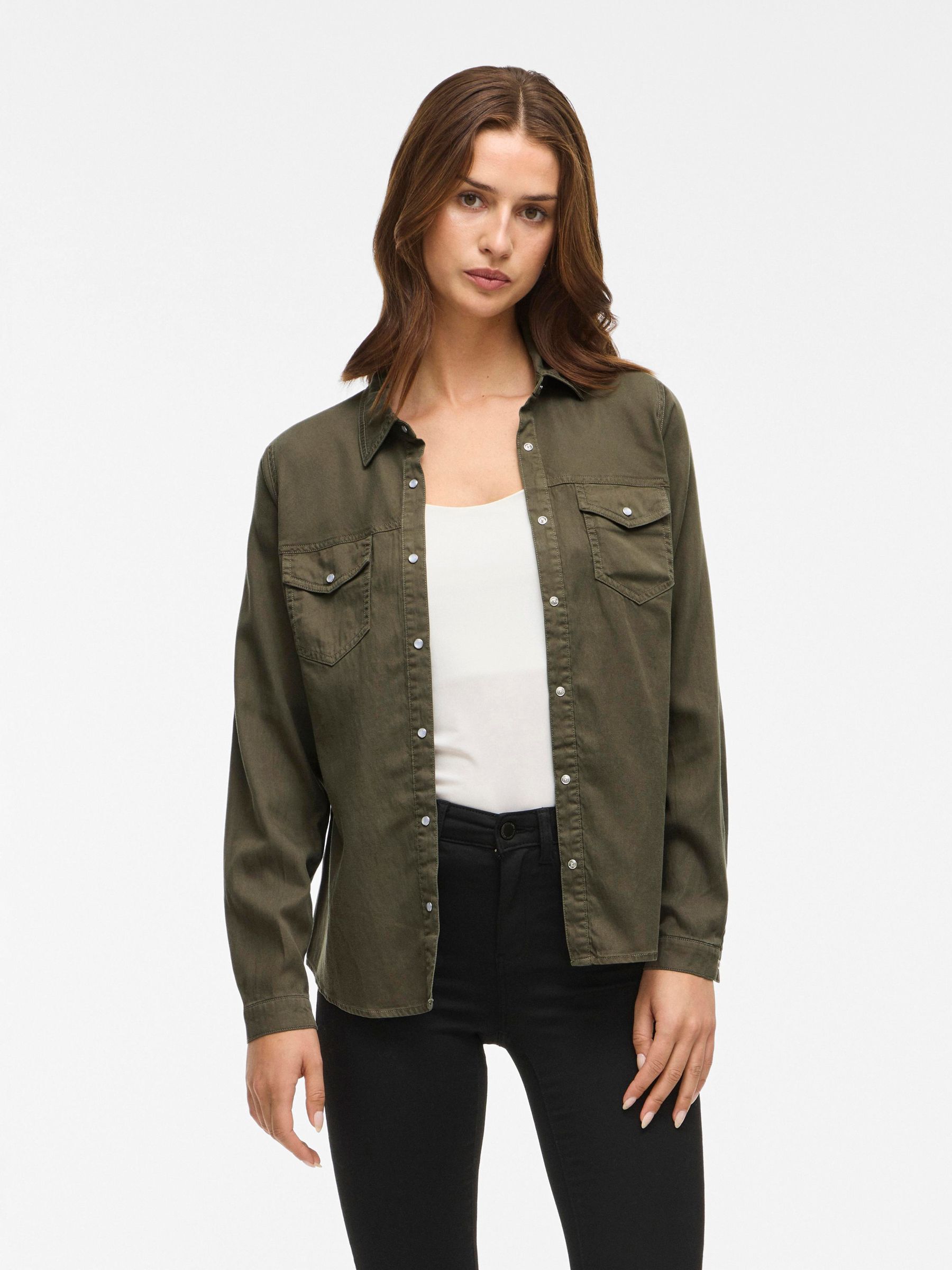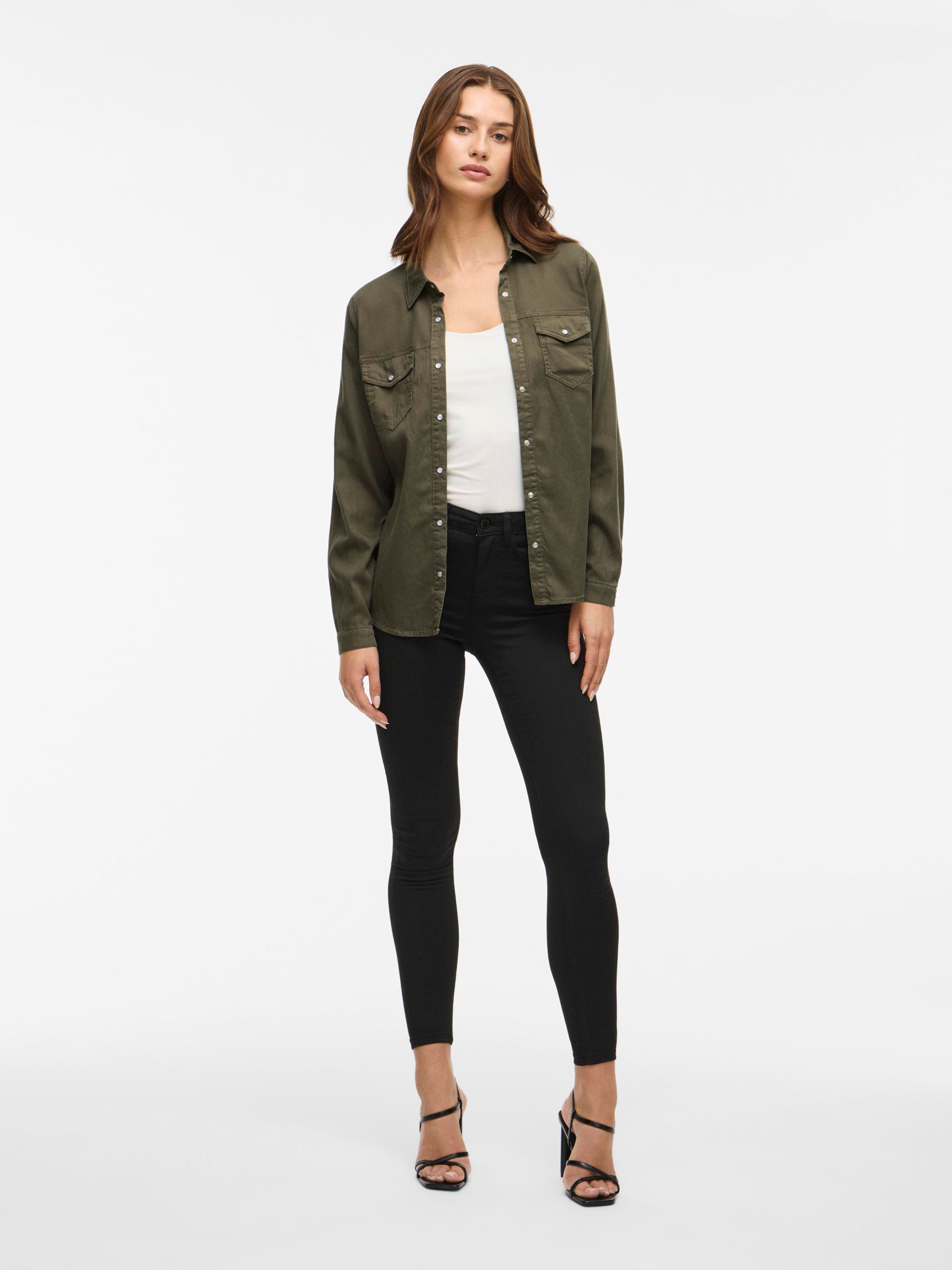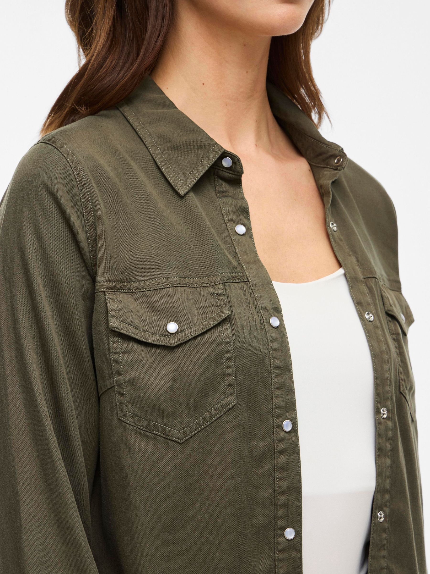 – Style name: VIBISTA- Denim shirt- Press buttons- Pockets at the chest- Long sleeves with button at the bottom- Length: 70 cm in size M- Sleeve length: 63 cm in size M- Our model is 179 cm tall and wears size M