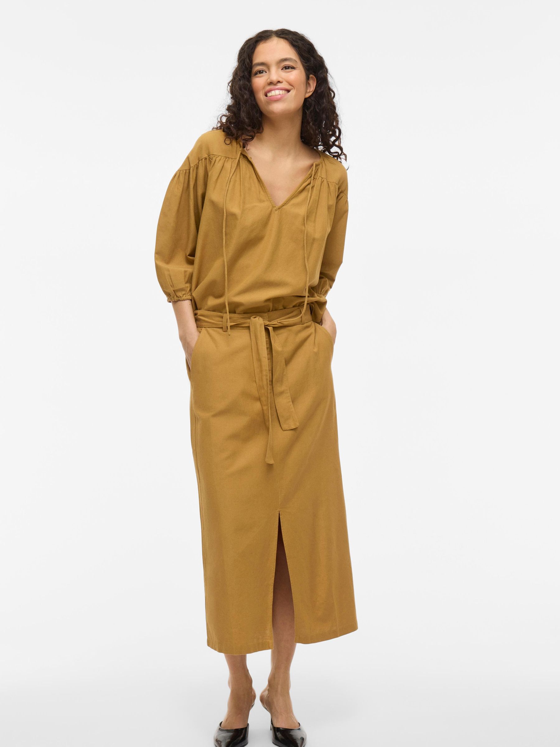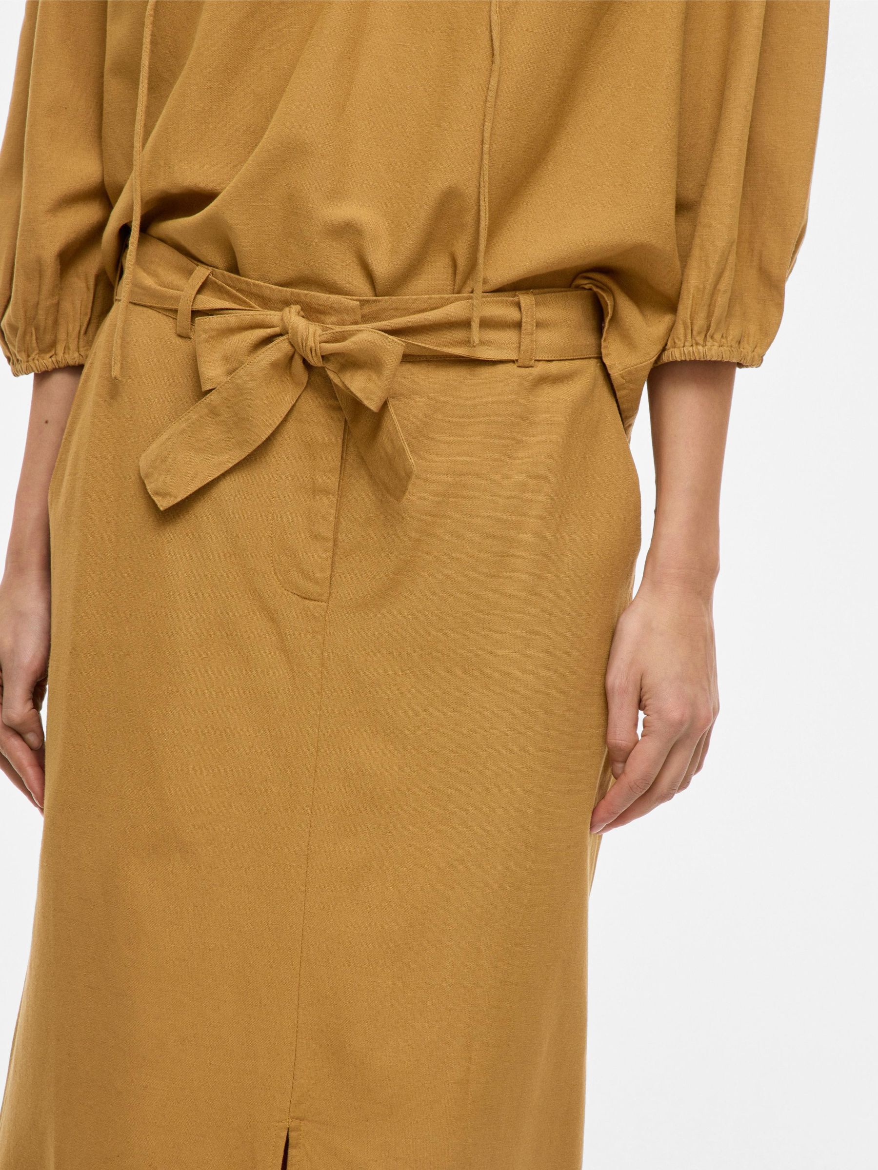 • Midi pencil skirt• Front slit detail• Zip-up fly with hook and button fastening• Stretch-back waist• Side pockets• Belt loops with removable belt• Includes linen• Regular fit• Length: 88.5 cm in size 38